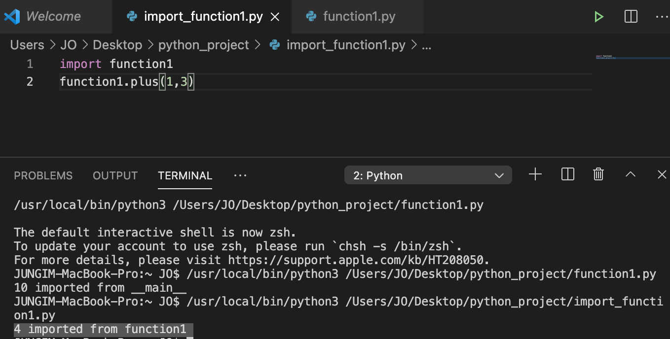 그럼, 해당 파일이 아닌 다른 파일(import_function1.py)에서 function1 모듈을 불러와서 import해서 실행시키는 경우에는 어떻게 나올까?