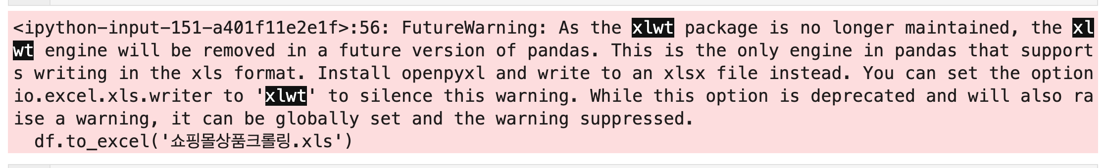 에러 메세지를 따라서 xlwt 모듈을 설치했다.