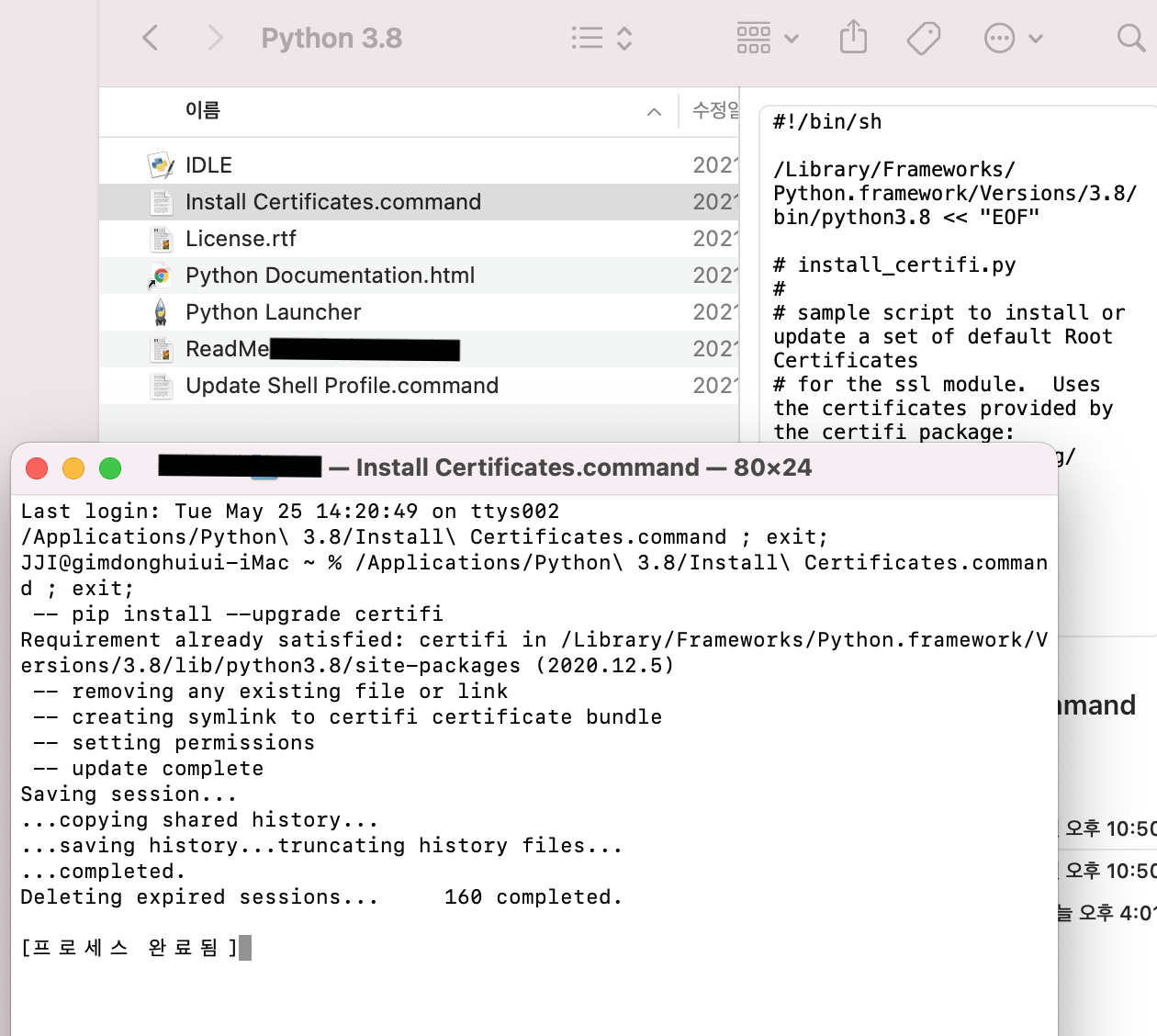 Install Ceritificates.command를 더블클릭으로 실행해주면 된다고 검색 내용을 찾았다.