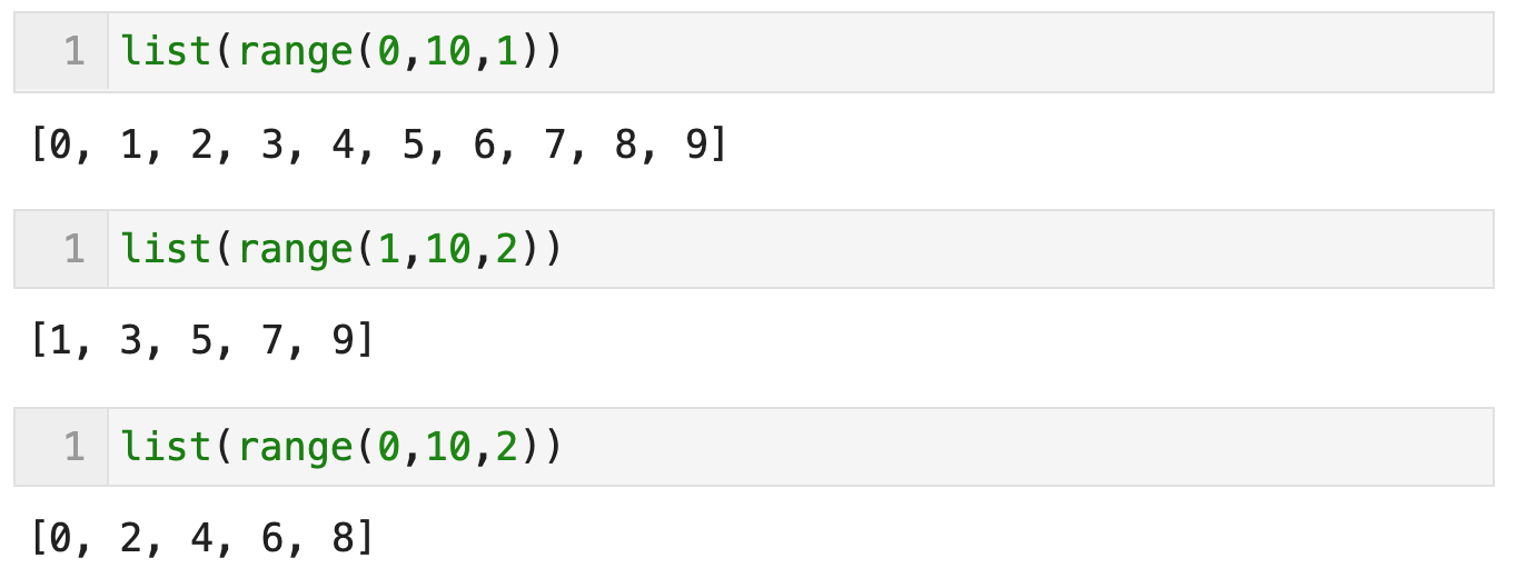 0부터 9까지 원소를 구하는데 그 간격을 1로 하는 경우 list(range(0,10,1))로 코드를 작성하면 되고, 위와 같이 출력 결과를 확인할 수 있다. 여기서 주의할 점은 파라미터를 입력할 때 원하는 원소의 끝값 더하기 1을 해주어야 한다는 점이다. 따라서 입력하는 파라미터가 9가 아닌 10이 입력되어야 0~9까지 원소가 들어간 리스트를 만들 수가 있다.