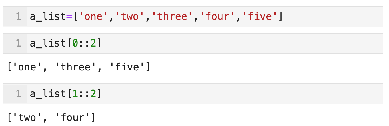 아래와 같이 a_list[0::2]의 의미는 a_list의 0번째 인덱스부터 2의 간격의 인덱스들의 요소들을 추출하라는 의미이다. 즉, 이 방법을 통해 0, 2, 4 ... 인덱스들의 요소들을 출력할 수 있다.