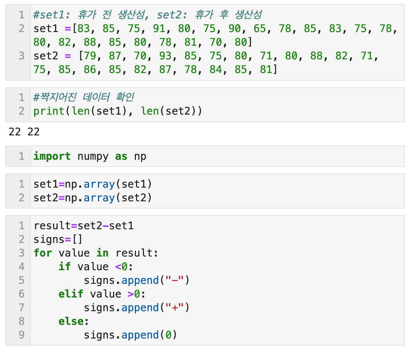 파이썬의 numpy, pandas, math 라이브러리를 사용해서 부호검정 예제를 진행해 보았다. set1은 휴가 전의 생산성을 나열한 리스트이고, set2는 휴가 후의 생산성을 나열한 리스트이다. 두 리스트는 전후 관계로 짝지어진 데이터이다. numpy를 사용하여 두 리스트를 array로 만들고, 부호를 계산했다.