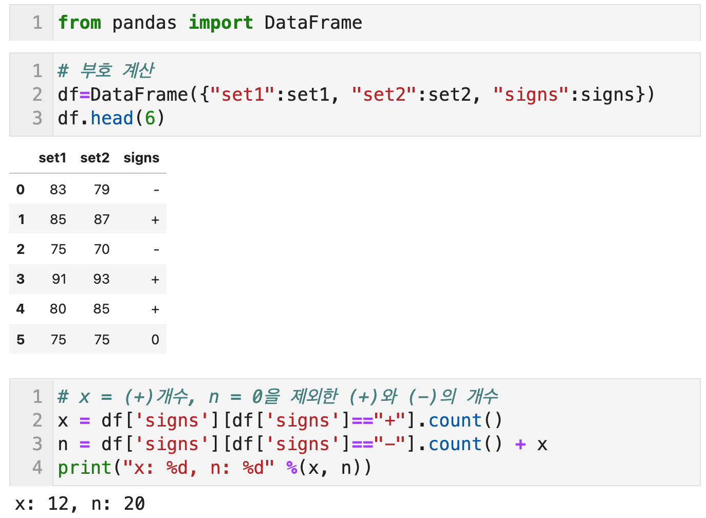 부호를 계산한 결과와 데이터를 pandas의 DataFrame 함수를 사용해 데이터프레임으로 정리하였다. 데이터프레임에 head함수를 사용하면 지정한 개수만큼의 행들을 확인할 수 있다. 여기서 (+)의 개수를 x로 놓고, 0을 제외한 (+)와 (-)의 개수의 합을 n으로 놓는다.
