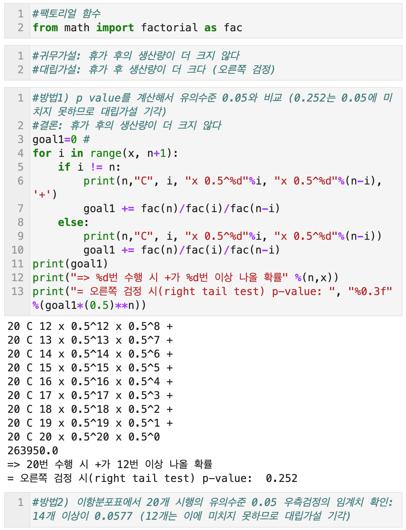 파이썬 math 라이브러리에는 팩토리얼(factorial)을 계산할 수 있는 함수가 있다. 팩토리얼 함수를 활용해서 해당 조건일 때의 p-value를 계산할 수 있다. 일반적으로 n이 30 이하이면 이항분포표를 기준으로 검정하고, 30 초과이면 근사 정규분포로 검정한다.