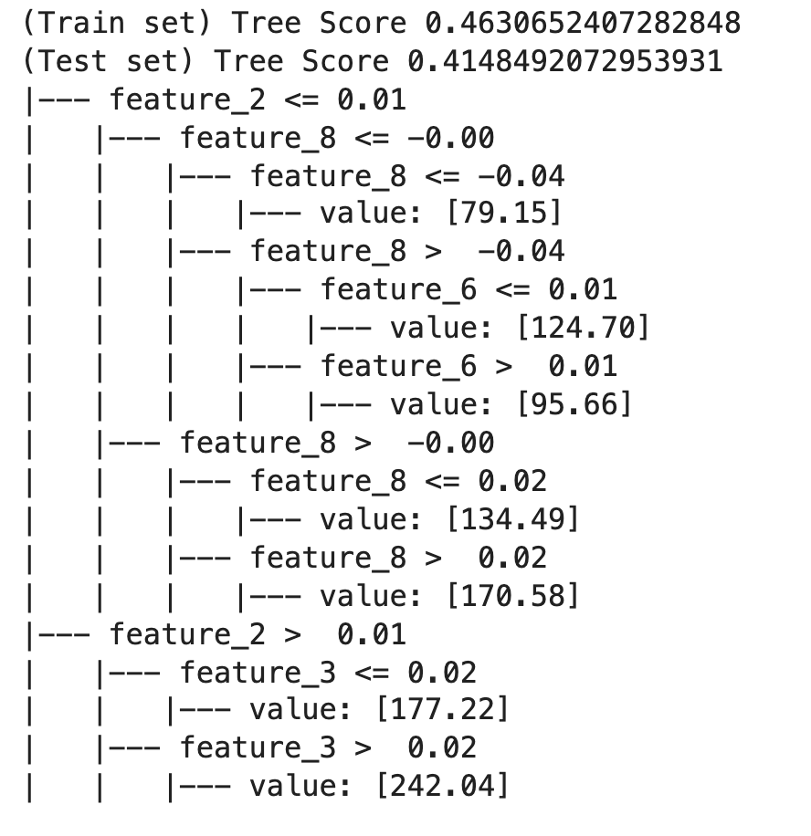 tree.score(X, y)로부터 얻는 값은 해당 모델의 결정계수이다. 모델의 설명력을 의미한다. 회귀트리의 경우, 훈련셋과 테스트셋의 설명력이 40~50%로 낮게 나타났다. 이럴 땐 파라미터를 조정하거나 아예 다른 학습 방식을 강구해야 한다.