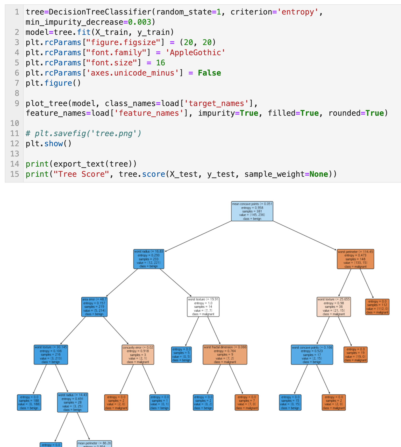 - ccp_alpha: 최소 비용-복잡성 가지치기에 사용되는 복잡도 매개변수. ccp_alpha보다 작은 비용-복잡도를 가진 하위 트리 중에 비용-복잡도가 가장 큰 하위 트리가 선택된다.