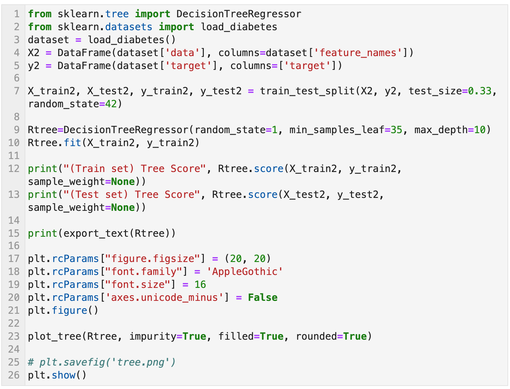 - criterion: 불순도 척도. 'squared_error', 'friedman_mse', 'absolute_error', 'poisson', default='squared_error'