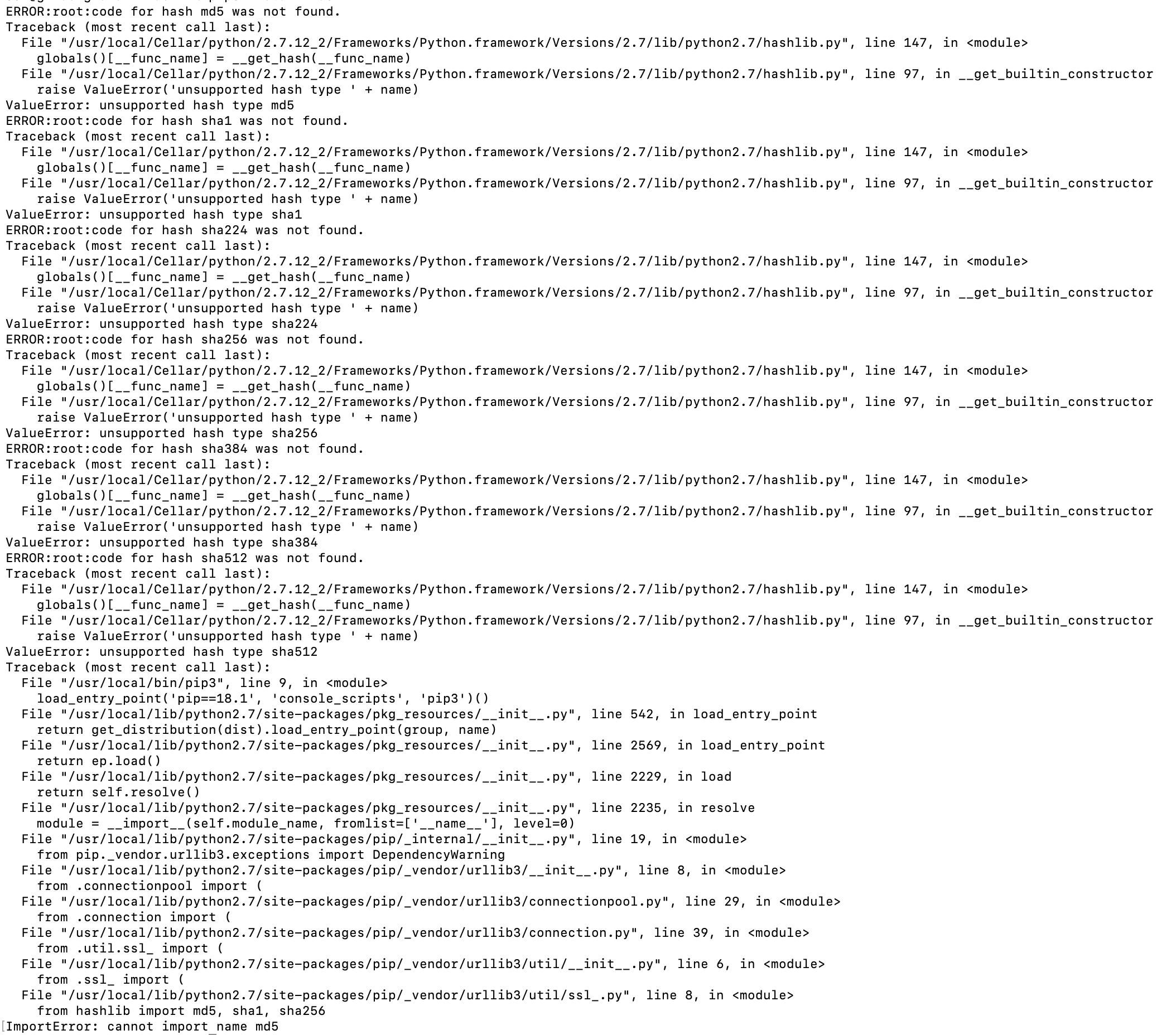 언젠가부터 파이썬 패키지가 제대로 설치가 되지 않고 있다. pip3 install 패키지명 이 간단한 명령어로 다양한 파이썬 라이브러리들을 편리하게 설치해왔는데 갑자기 ImportError: cannot import name md5 이 에러로 추가 패키지를 설치를 못하고 있다.