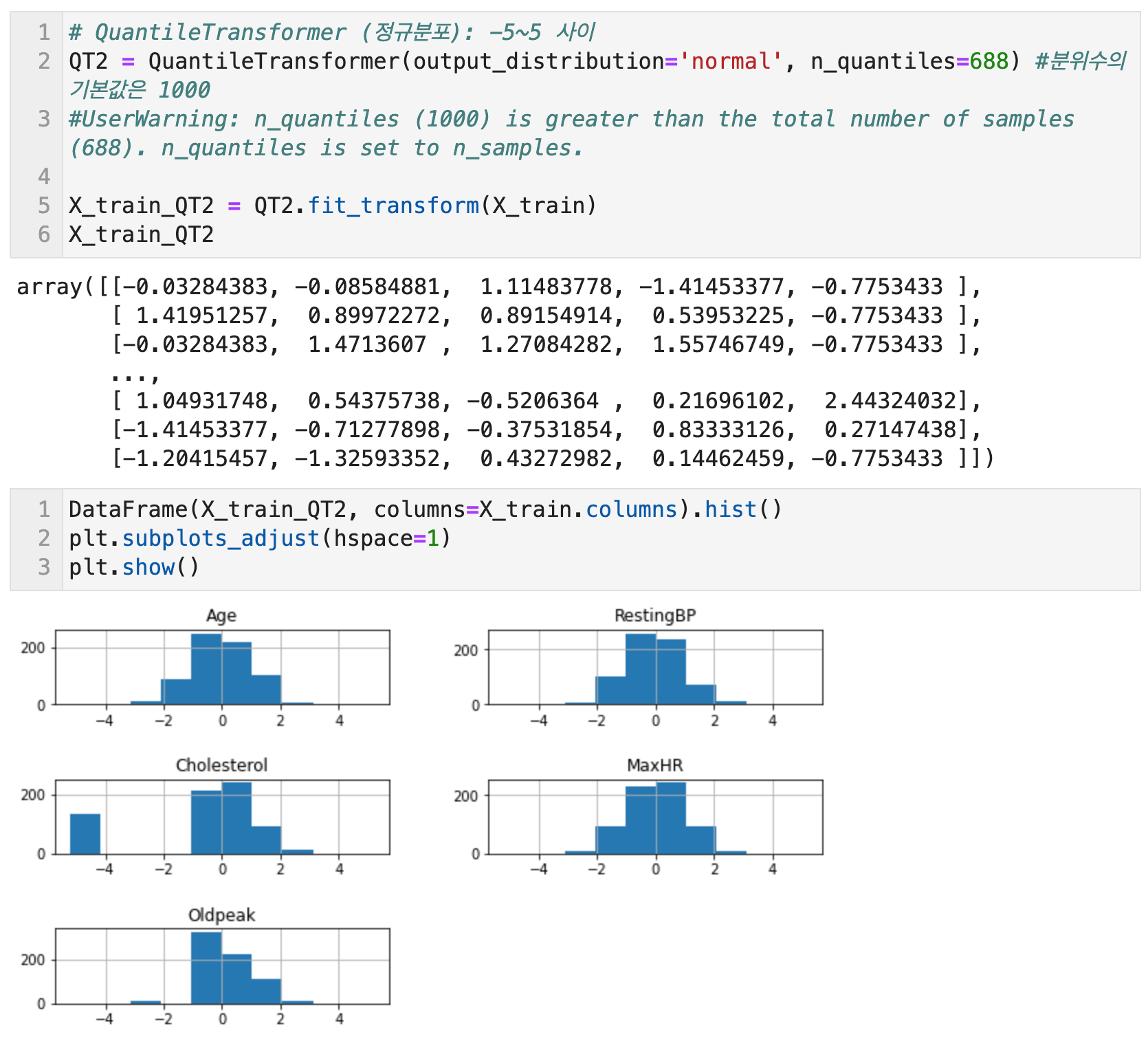 Scikit Learn의 QuantileTransformer로 균등분포와 정규분포로의 선형변환이 가능하다. 균등분포는 1000개의 분위를 사용하여 데이터를 균등하게 배포시키는 방법이다. RobustScaler와 비슷하게 이상치에 민감하지 않으며 전체 데이터를 0과 1사이로 압축한다. 분위수는 n_quantiles 매개변수에서 설정할 수 있으며 기본값은 1000이다. QuantileTransformer(output_distribution='uniform', n_quantiles=688) 식으로 코드를 작성한다. 여기서 output_distribution을 uniform으로 하면 균등분포가 되고, normal로 하면 정규분포가 된다.