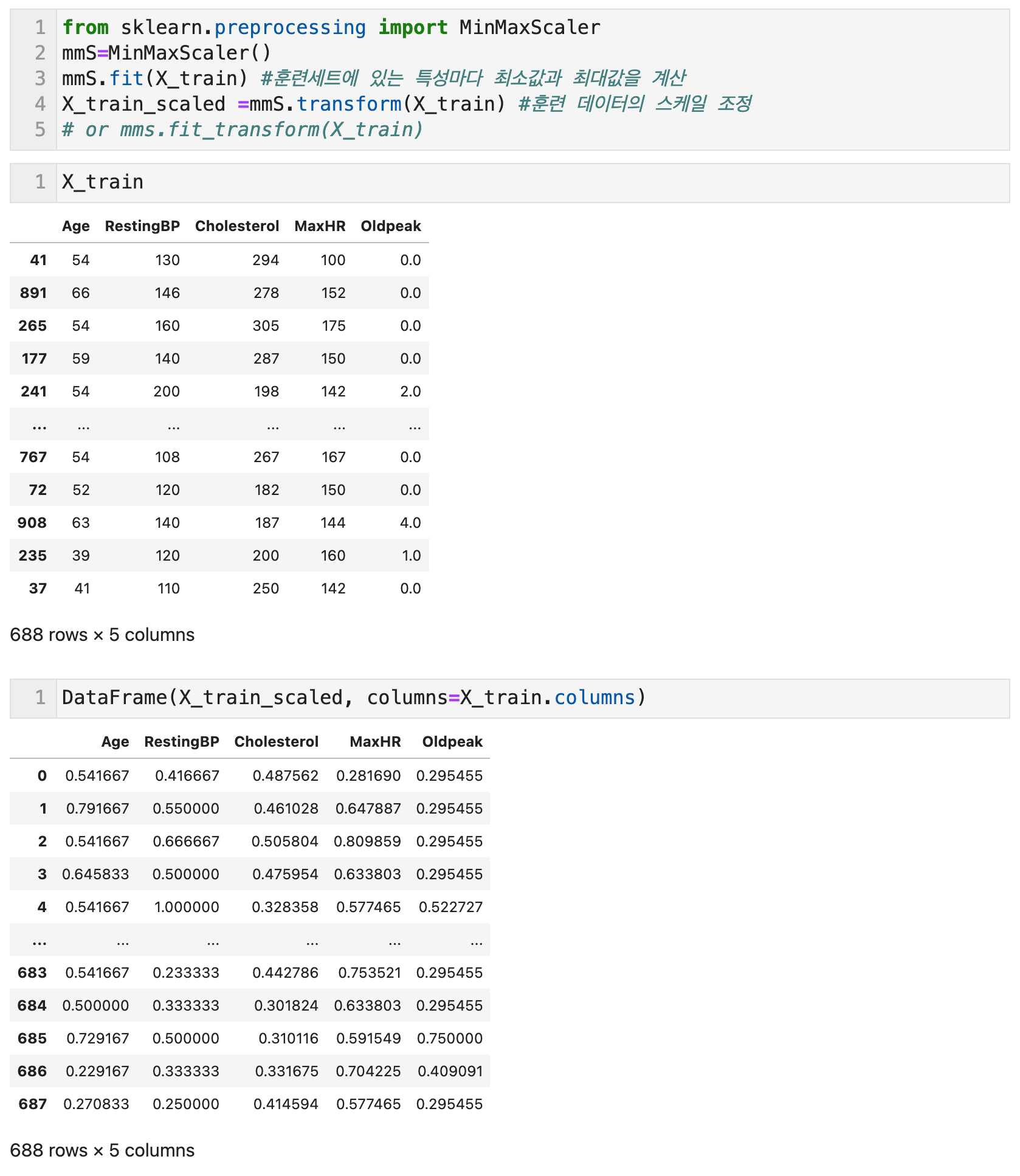 MinMaxScaler()의 객체에 .fit(데이터)를 하면 객체에 데이터에 있는 특성마다의 최소값과 최대값을 계산한다. 이를 바탕으로 .transform(데이터)를 동일한 객체에 적용하면, 스케일을 조정한 데이터 결과물이 나오게 된다. 왼쪽 위에서 원본값과 스케일링한 값을 비교할 수 있다.