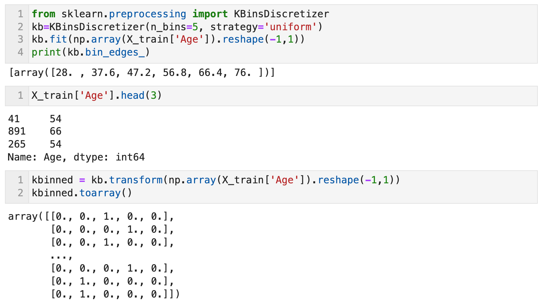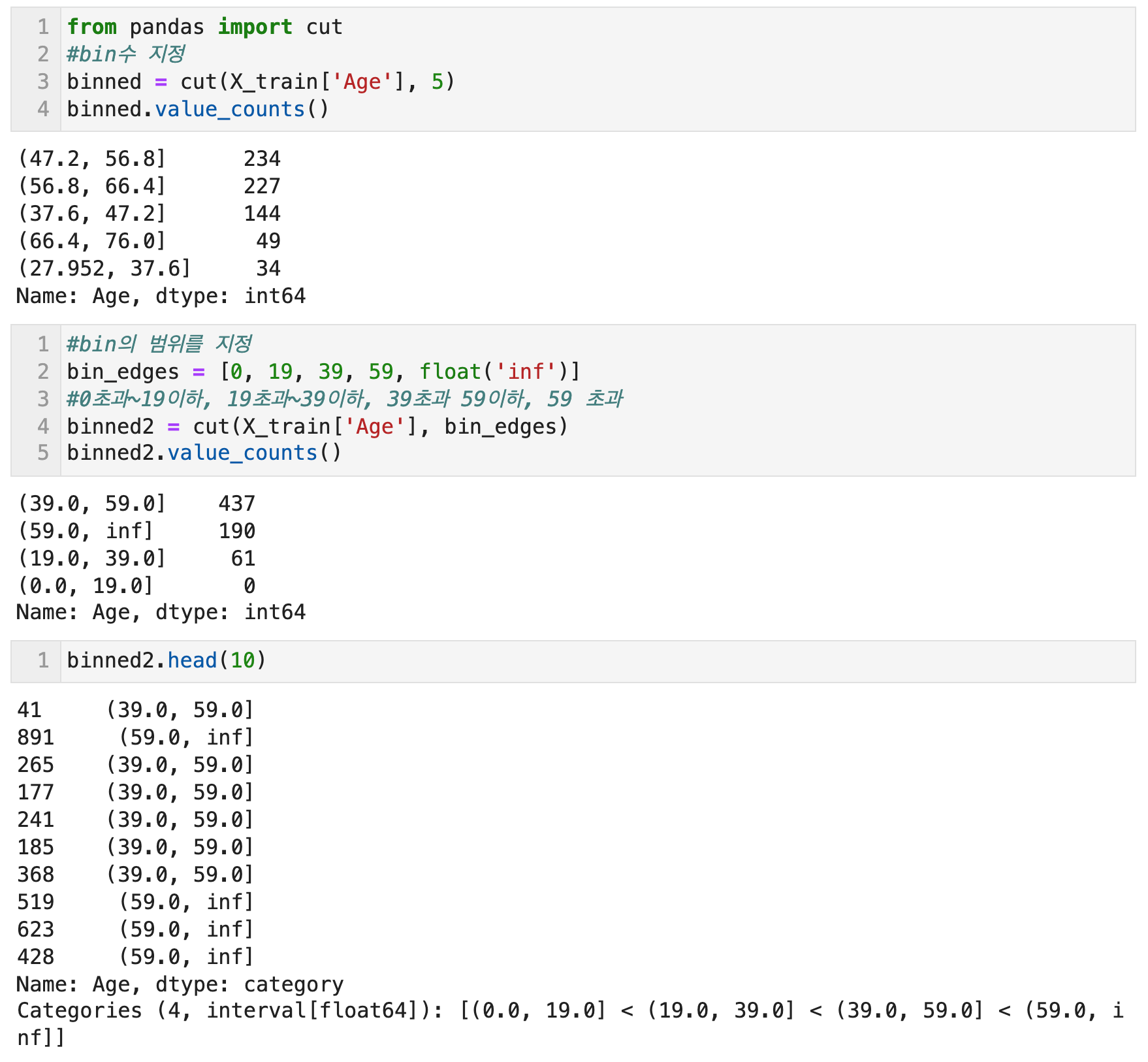 pandas의 cut 함수로, 지정한 bins 수만큼 균일한 범위로 데이터를 분할 하거나 지정한 범위대로 데이터를 분할 할 수 있다. Scikit Learn의 KBinsDiscretizer 함수를 이용하면, 지정한 bins 수대로 데이터를 분할한 후 각 구간 별로 원핫인코딩을 적용할 수 있다. 구간마다 하나의 새로운 특성이 생기므로 희소 행렬이 만들어진다.