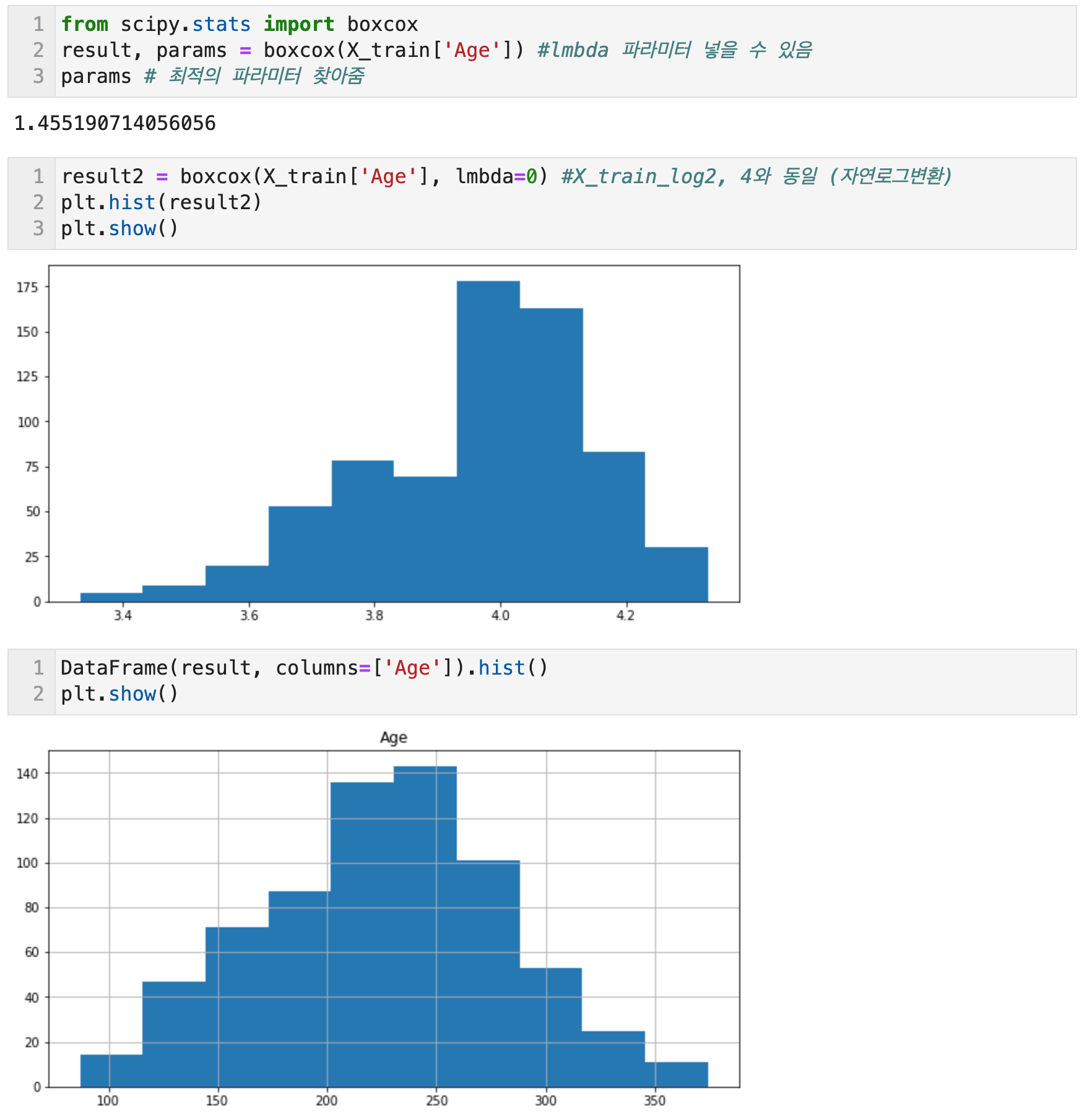 한편, Scipy의 boxcox 함수를 사용하면 result, params = boxcox(data)를 통해 params에 최적의 파라미터가 할당된다.