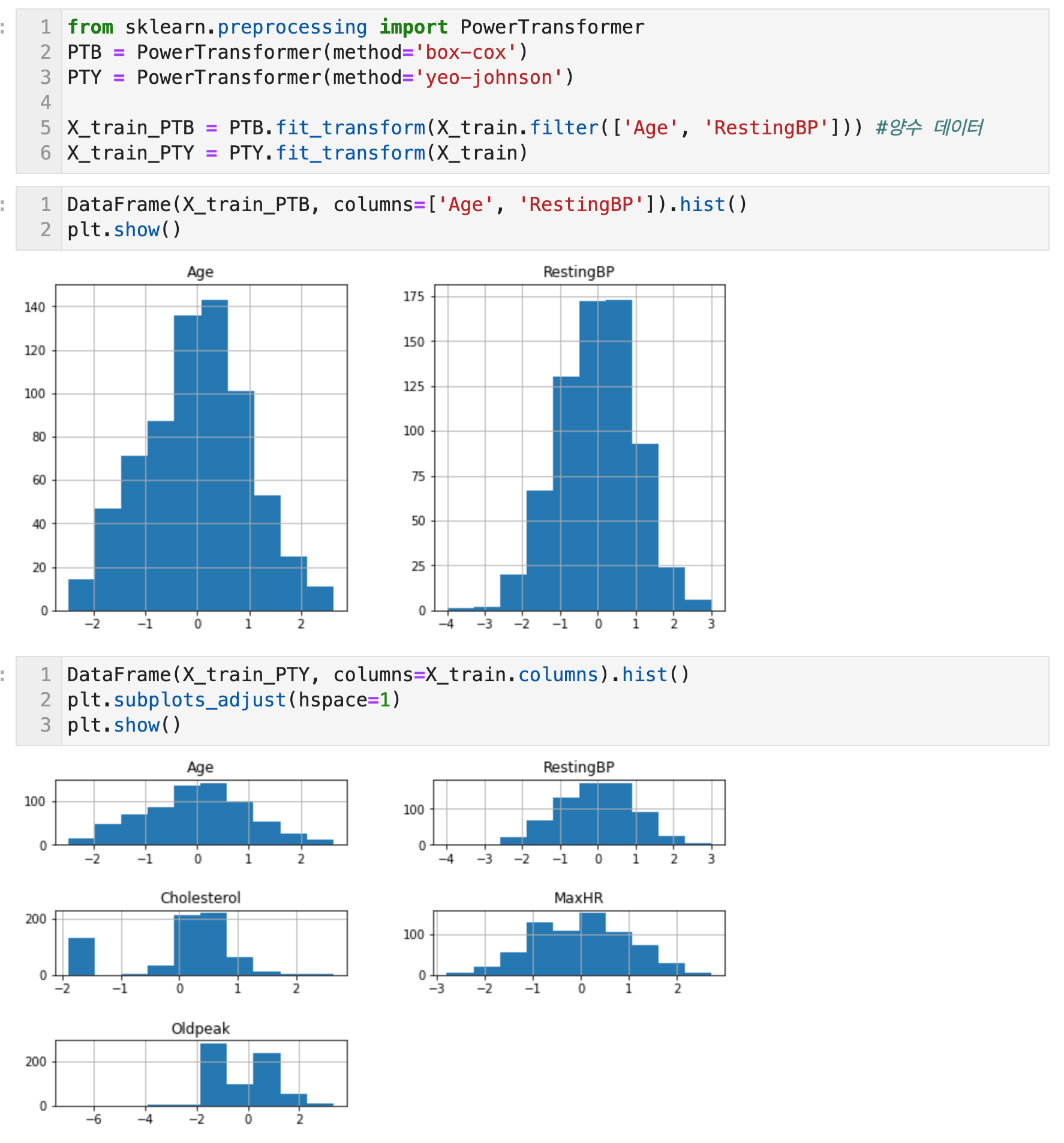 Scikit Learn 패키지의 PowerTransformer 함수를 사용하여 구현한다. method 매개변수에 'yeo-johnson', 'box-cox' 알고리즘을 지정할 수 있다. 기본은 'yeo-johnson'이다.