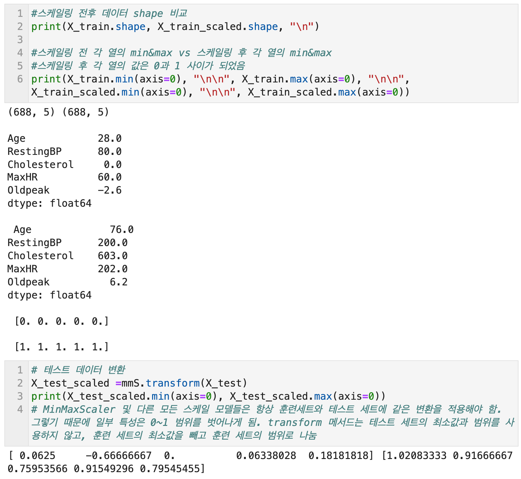 스케일링 전후 데이터의 shape을 비교하면, 행열의 숫자가 동일한 것을 확인할 수 있다. 또한 스케일링 전 데이터의 최소값과 최대값을 열별로 확인하면 값들이 다양한 것을 볼 수 있는데, 스케일링 후에는 모든 열(feature)의 최소값이 0, 최대값이 1로 스케일링된 것을 확인할 수 있다.