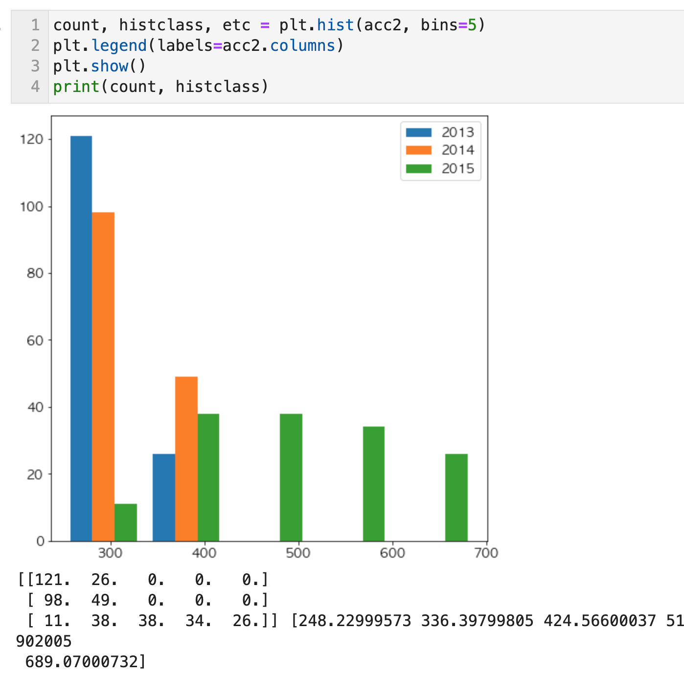 plt.hist()의 경우 bins 파라미터로 계급의 수를 나눌 수 있고 빈도수(아래, count)와 각 계급값(아래, histclass)을 리스트로 반환 받을 수 있따.