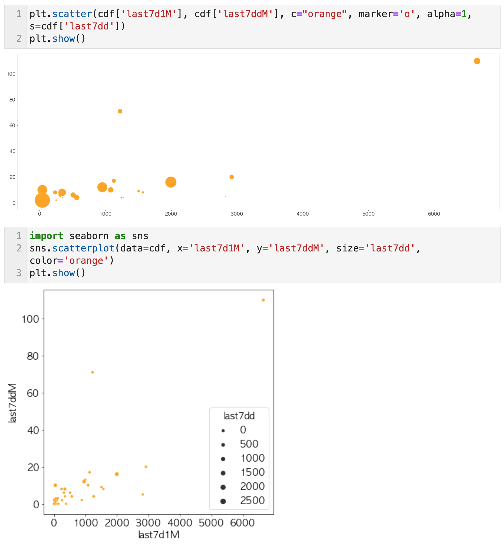 위에서 그린 산점도에서 사이즈를 나타내는 파라미터를 설정하면 버블차트가 된다. plt.scatter()의 경우 s를 사이즈로 사용하고, s=사이즈 데이터 리스트로 입력한다. sns.scatterplot에서는 size로 나타내고 data자체를 입력한 경우에는 data 내에 있는 사이즈 데이터의 열이름을 입력하면 된다.