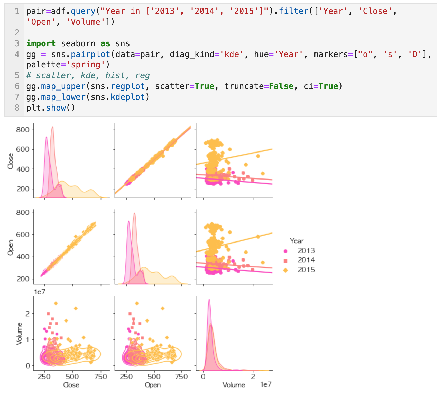 페어플롯으로 각 변수간의 관계도를 한눈에 확인할 수 있다. 아래 만든 페어플롯의 경우 대각선에는 해당 변수의 KDE 그래프(diag_kind='kde')를 나타내고, 위에는 regplot, 아래에는 contour plot을 그렸다.