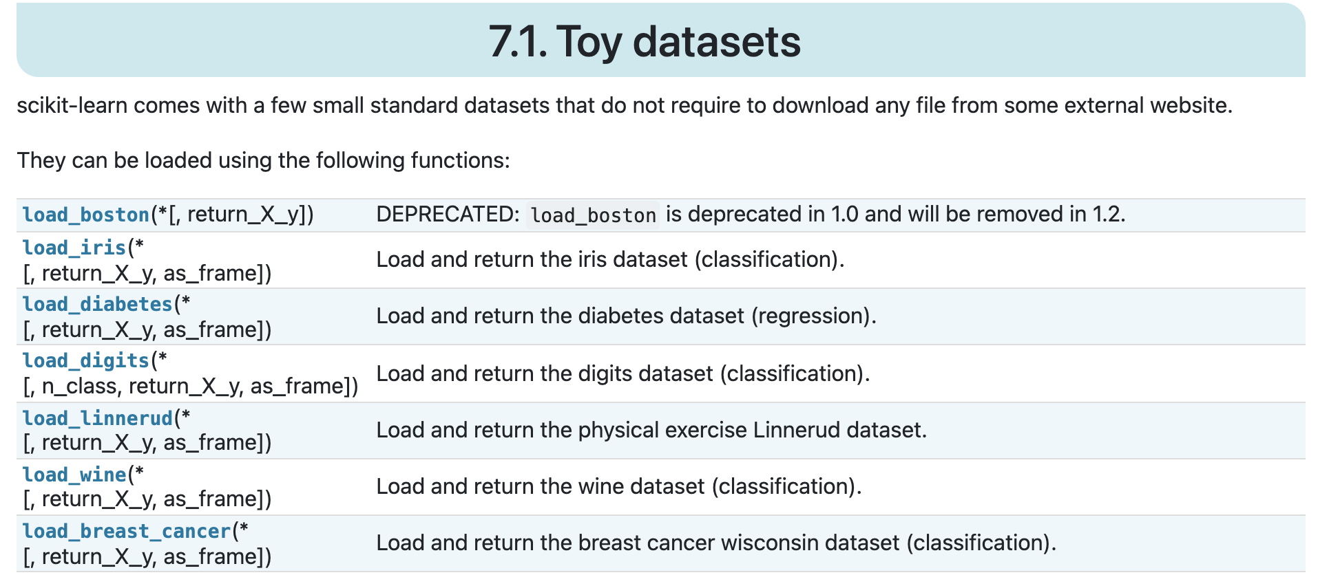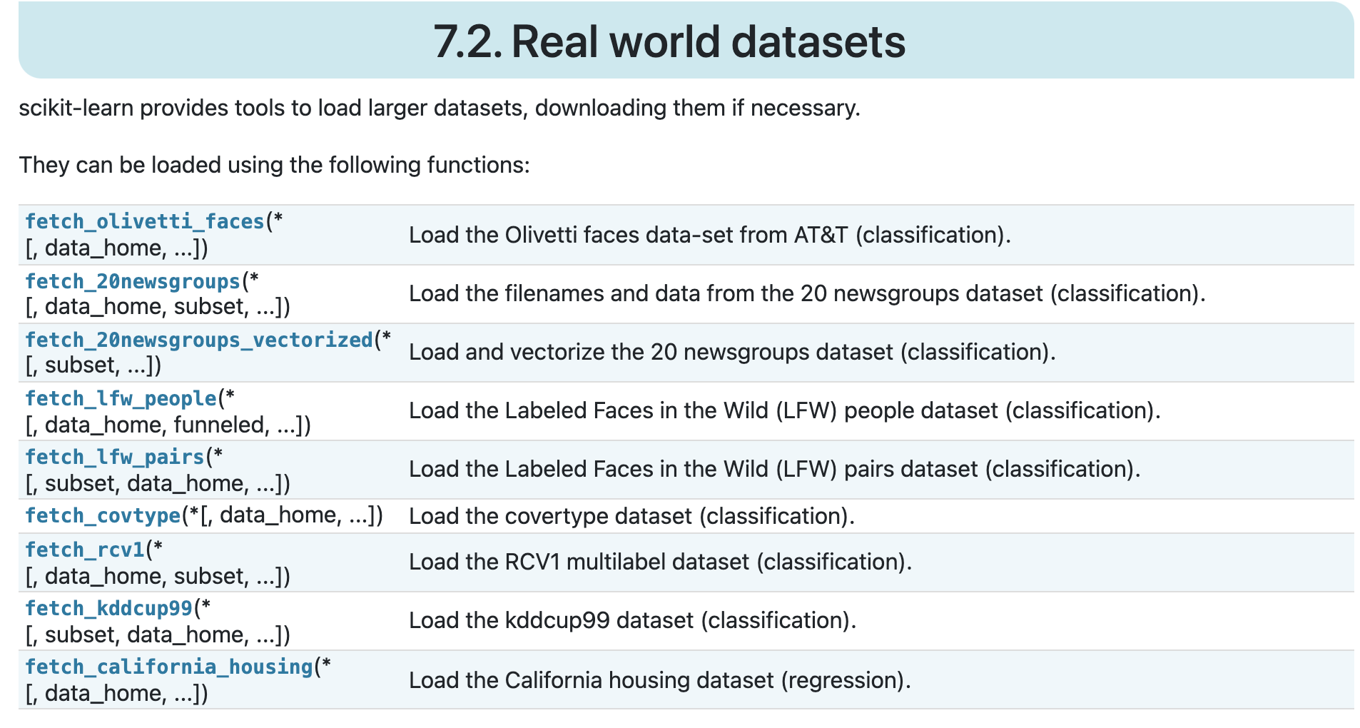 Sickit Learn에서는 다양한 머신러닝, 통계기법을 사용해볼 데이터셋들을 제공하고 있다. 나는 주로 분류(classification)나 회귀(regression)에 적합한 데이터 셋들을 활용해서 연습한다. 데이터 목록은 아래와 같다.