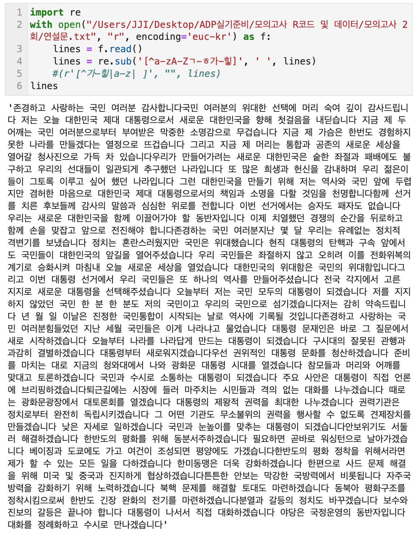 Q1) ‘연설문.txt’ 데이터를 읽어온 뒤 숫자, 특수 문자 등을 제거하는 전처리 작업을 시행하시오
