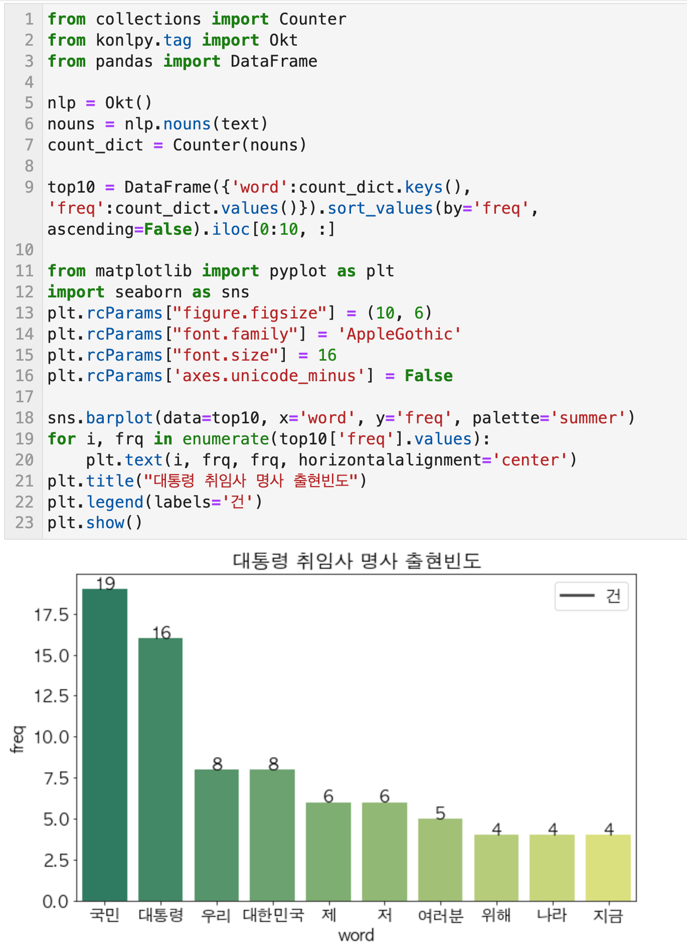 문장에서 명사를 추출하기 위해 konlpy 패키지에서 Okt 메서드를 사용하였다. 명사(nouns)만 추출하고 이것을 Counter로 세어서 딕셔너리 형태로 정리하였다. 그리고 나서 딕셔너리에 있는 단어들을 'word'로, 빈도들을 'freq'로 하는 데이터프레임을 만들었고, 빈도수 순으로 내림차순 정렬하고 상위 10개의 단어를 추출하였다. matplotlib로 plt.bar()해서 막대그래프를 만들수도 있지만, 여기서는 seaborn을 사용해서 barplot을 그려보았다.
