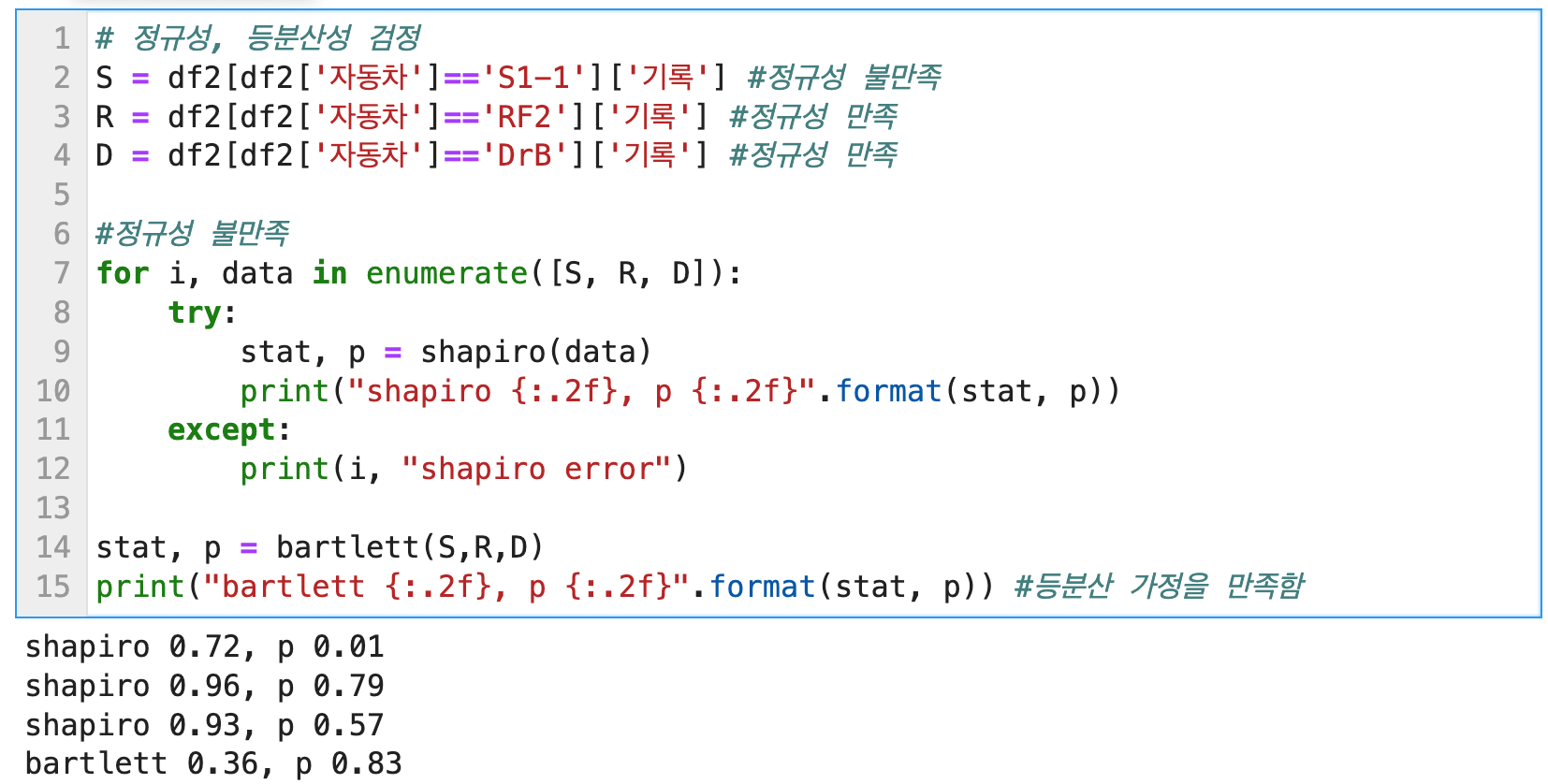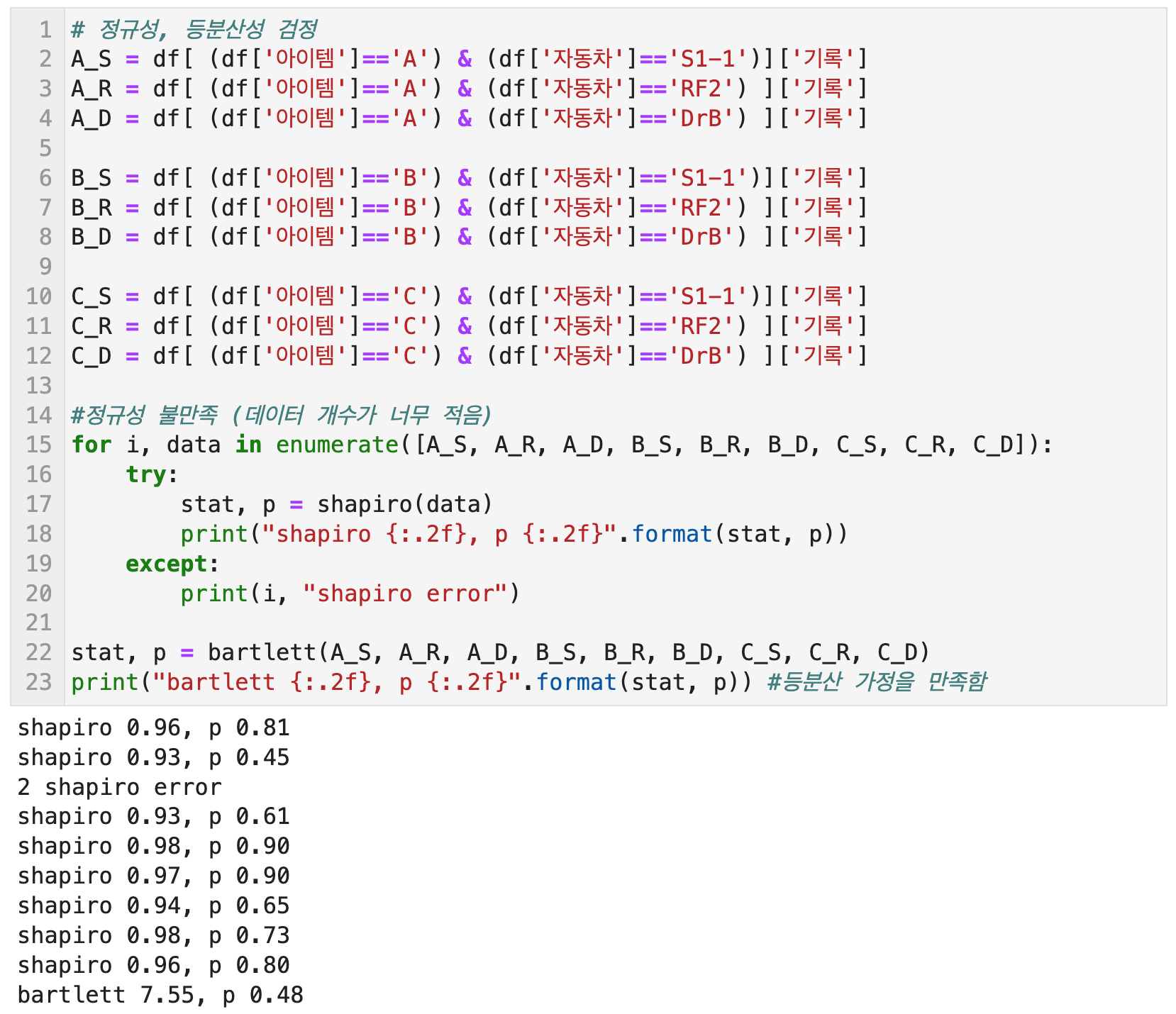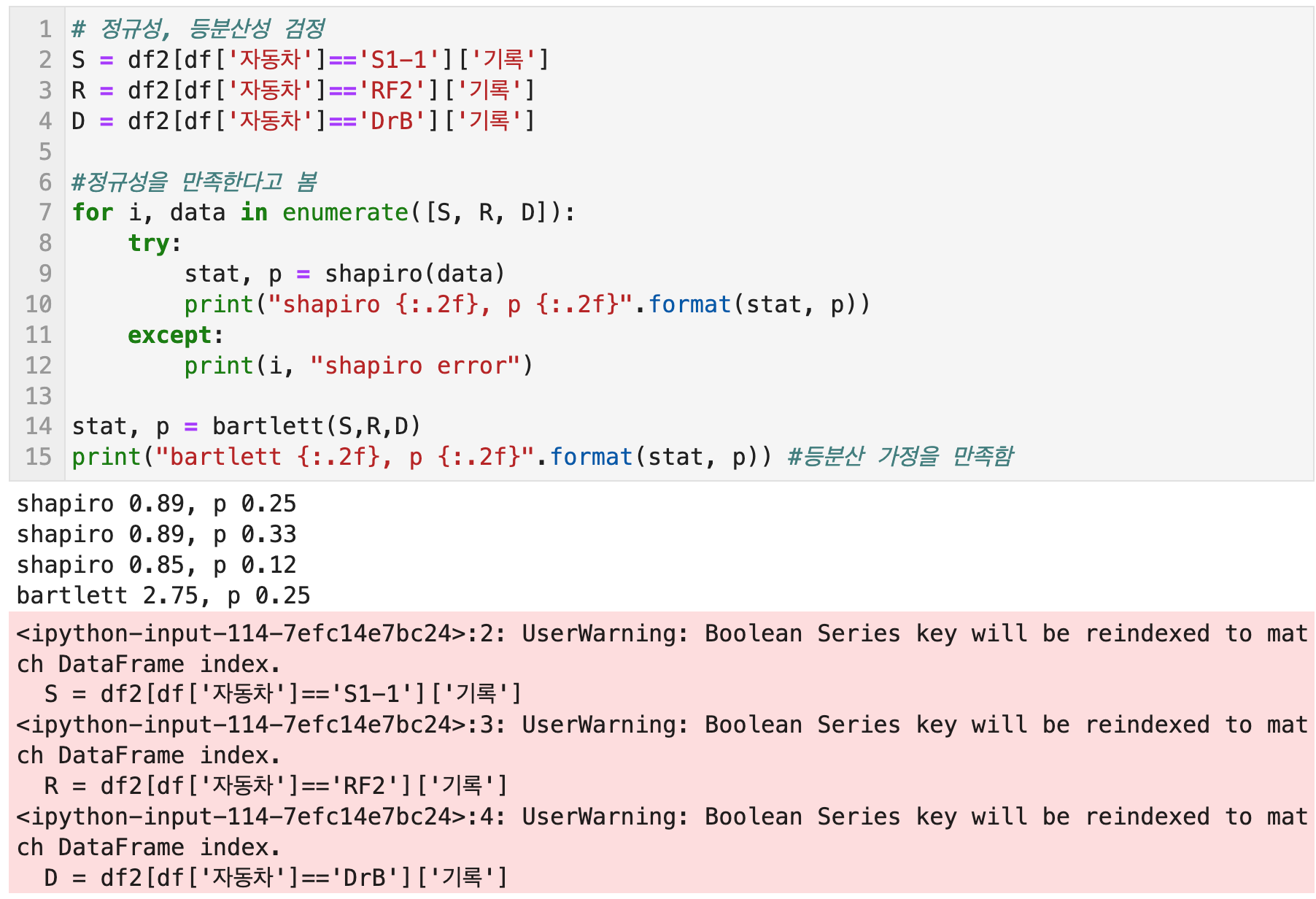 이원분산분석을 위해 먼저 데이터의 정규성과 등분산성을 검정하고 있던 차에 아래와 같이 UserWarning이 떴다.