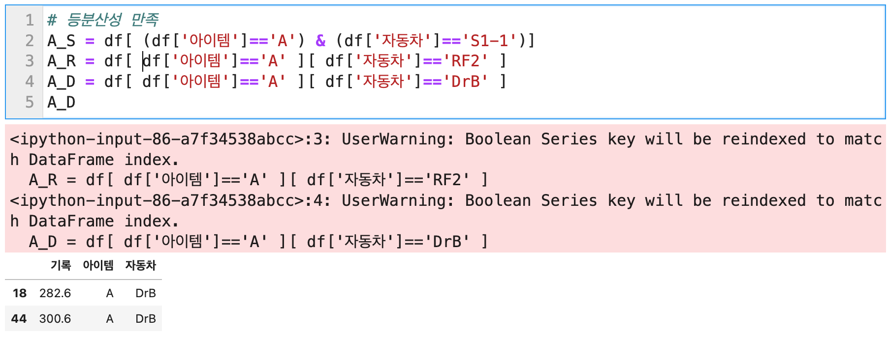 일단, 첫번째 케이스의 경우, df2[df['자동차'] == 'S1-1']['기록']으로 되어 있는데 원래 의도했던 바는 df2라는 데이터프레임에서 자동차라는 열의 값이 S1-1인 데이터의 "기록"값만 sorting을 하겠다는 것이다. 그런데 보면 df2[조건]에서 조건의 내용이 잘못 들어가있다 ^^; df2['자동차']=='S1-1'] 이라고 했어야 하는 것이다. 잘못 적었다. 게다가 잘못적은 코드를 세번 복붙해서 실행을 시켰더니 UserWarning도 세 줄이나 떴다.