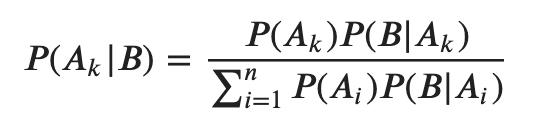 B가 일어났을 때 Ak가 일어날 조건부 확률을 구하기 위해서는 아래와 같이 분모에 P(B)의 전확률이 들어가야 한다. 그리고 A들 중에서도 관심이 있는 Ak와 B의 교집합을 구하기 위해 분자식을 아래와 같이 쓴다.