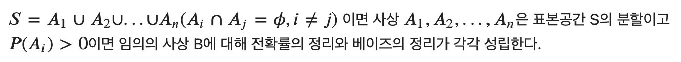전확률의 정리와 베이즈의 정리가 성립하기 위해서는 아래와 같이 표본공간 S를 이루고 있는 n개의 부분집합 A들이 있어야 한다. 즉, 부분집합 A들은 서로 겹치는 부분이 없어야 하고(교집합이 공집합), A들의 확률을 다 합쳤을 때 1이 되어야 한다.