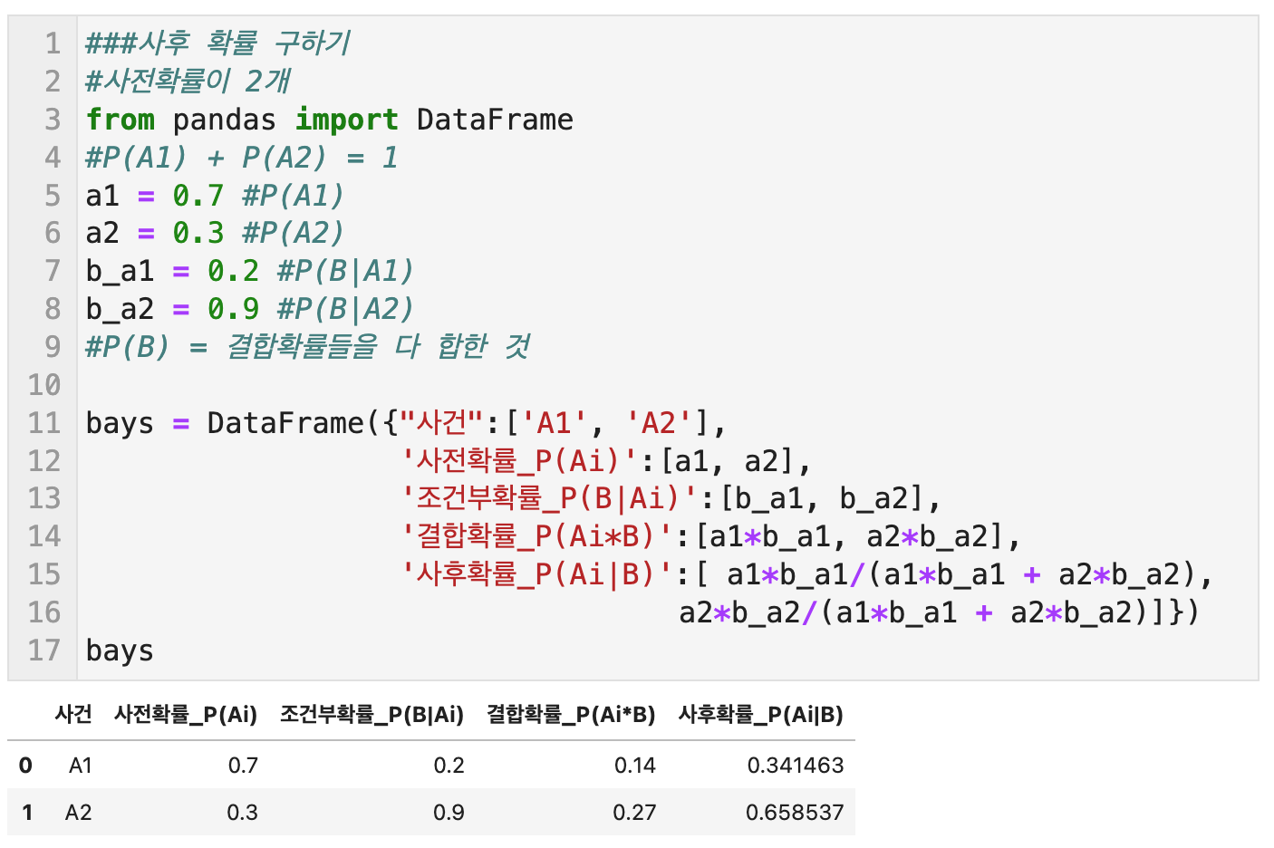 여기서도 전확률은 결합확률 열의 값들을 다 더한 값이다. P(B)는 제품이 불량일 확률이다. 이 확률을 분모에 놓고 원하는 사건을 분자에 입력하면된다. 제품 하나를 추출하였는데 그 제품이 불량일 때 이 제품이 기계 A1에서 만들어졌을 확률을 구해보면, 위의 0 행의 사후확률 0.127이 된다. 이 값은 0.004 / (0.004+0.014+0.0135) 로 구한다.