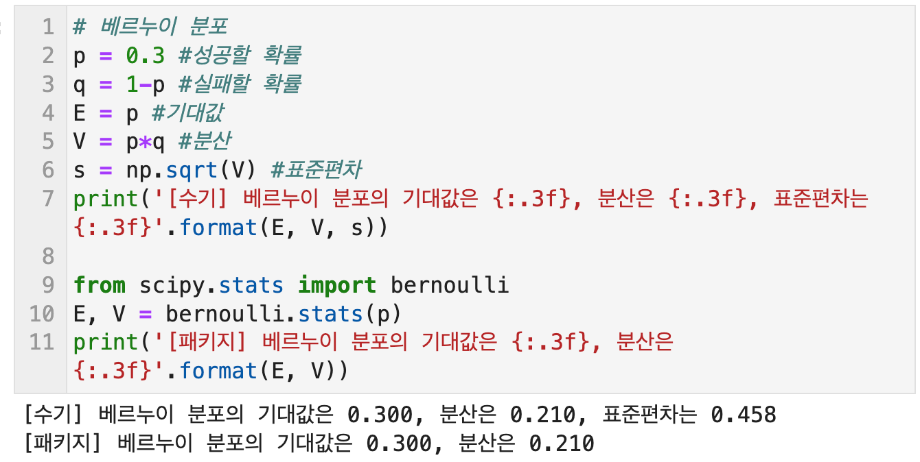 scipy.stats에서 bernoulli를 import하여 bernoulli.stats(성공확률)을 입력하면 기대값과 분산을 쉽게 구할 수 있다.