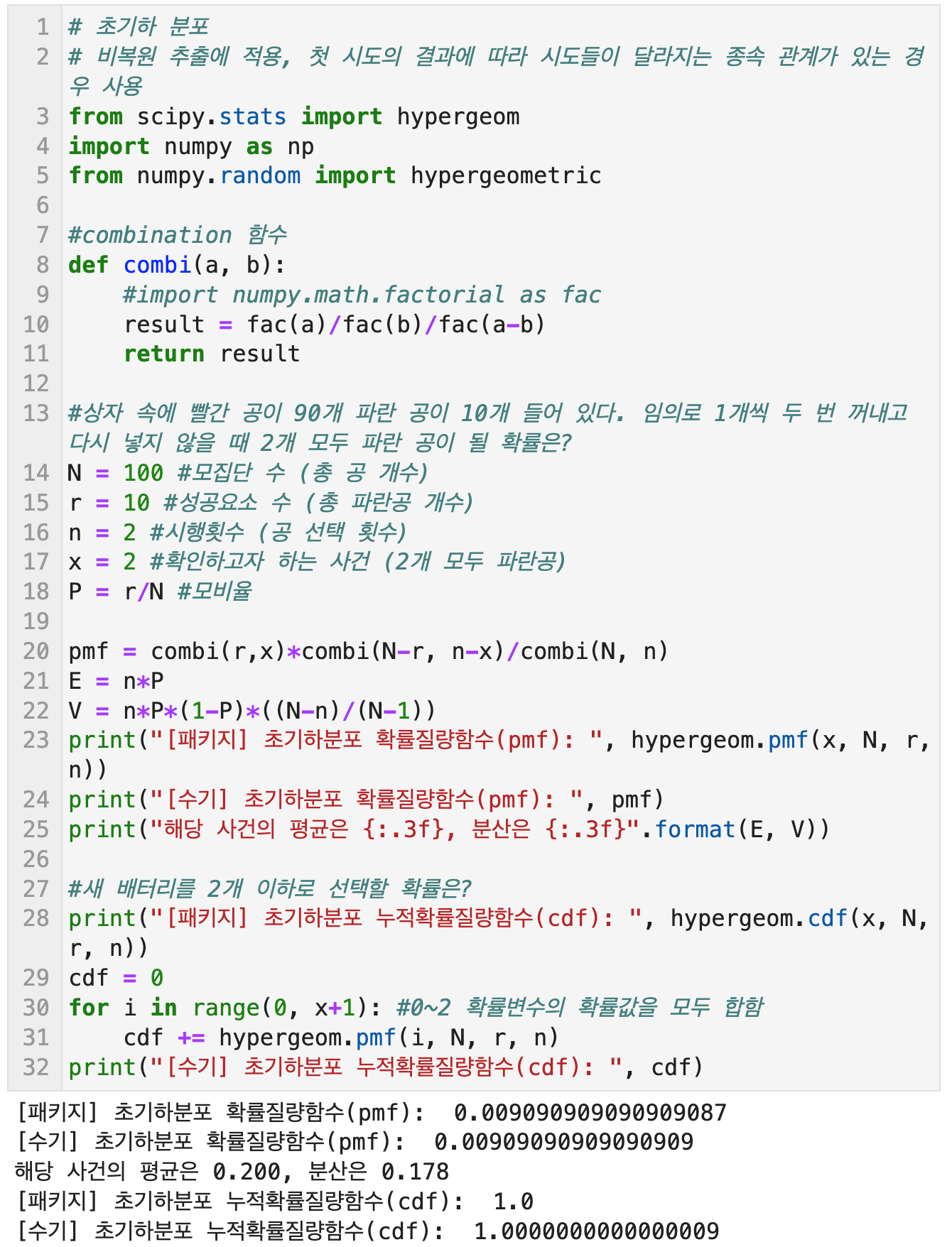 비복원추출에 적용되는 분포이다. 첫 시도의 결과에 따라 두번째 시도의 상황이 달라지므로 시도들이 종속 관계에 있다. 이와 같이 종속관계에 있는 확률은 초기하분포의 확률질량함수에 의해 계산된다.