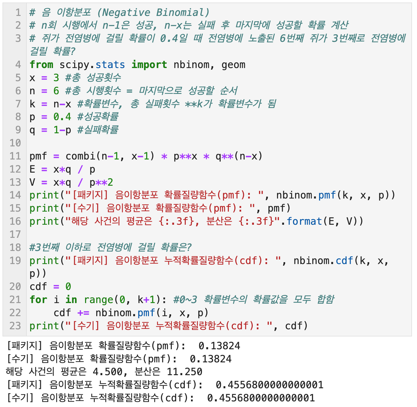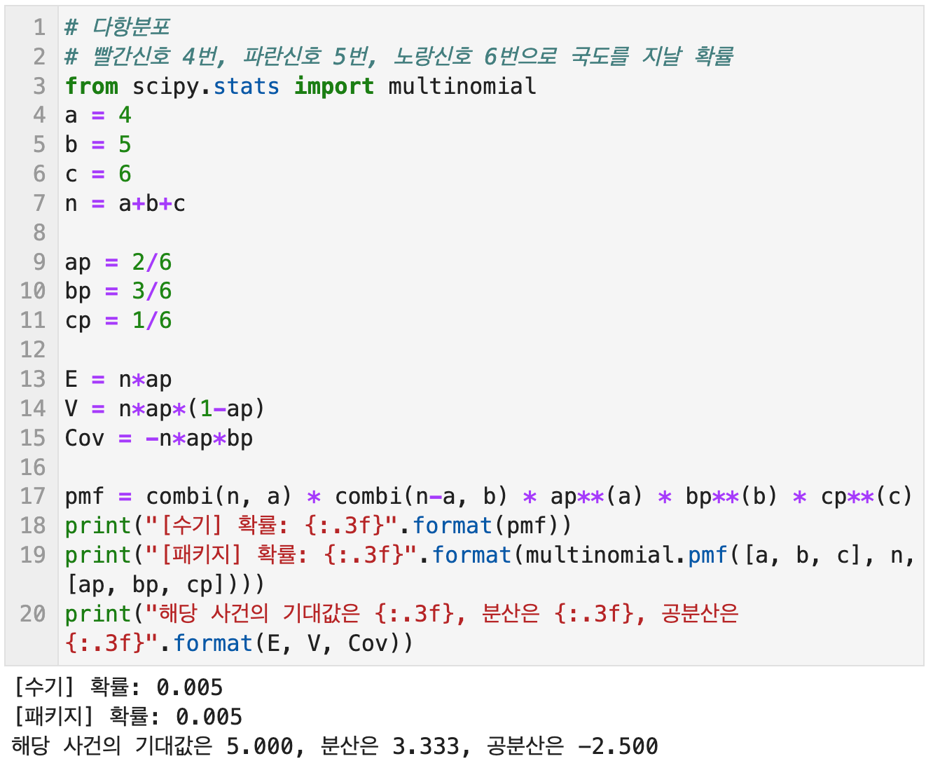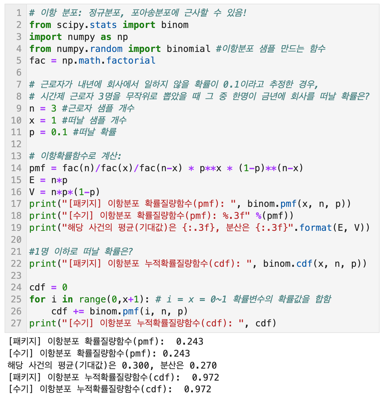 파이썬에서 자주 쓰이는 통계 패키지 중 하나인 scipy를 사용해서 다양한 이산형 확률분포의 값을 쉽게 얻을 수 있다. 아래에서는 수동으로 계산하는 코드와 패키지를 이용해 계산하는 코드 모두를 작성해 보았다.