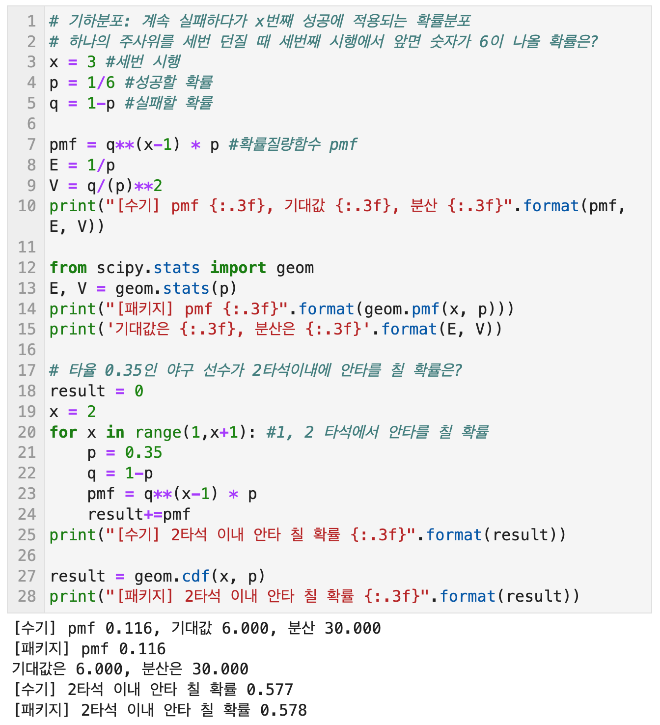 scipy 패키지 중에서 geom으로 기대값과 분산을 구할 수 있고, geom.pmf()함수에 파라미터로 x(전체 시행횟수), p(성공할 확률)을 순서대로 입력하면 확률질량함수 값을 구할 수 있다.