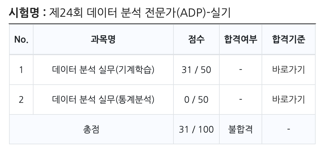 그리고 어느덧 24회 실기 시험! 이렇게 열심히 공부했으니 이걸로 충분할 것이라고 생각했는데 그것은 큰 오산이었다. 내 시험 성적(기계학습 31점, 통계분석 0점)에서도 볼 수 있지만, 이 시험에서 내가 간과한 것은 "통계분석"이었다. 의외로 수험생들이 이부분을 놓치고 있을 수도 있겠다는 생각이 든다. 일반적으로 '데이터 분석'이라 하면 머신러닝만 생각을 하는데 사실 ADP는 기계학습이 50점, 통계분석이 50점인 시험인 것이다. 이 사실을 미리 알았더라면 한회 정도는 더 빨리 합격할 수도 있지 않았을까하는 아쉬움이 남는다.