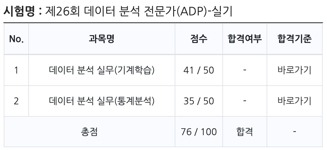 그리고 25회 ADP 실기를 쳤고, 64.5점으로 불합격 하였다. 하지만 이번에는 그렇게 절망적이지만은 않았다. 확실히 공부한 효과가 나타났기 때문이다. 기계학습도 미세하게 점수가 올랐고 통계분석이 빵점에서 29점이 되었다. ㅎㅎ 스터디원들 중에서도 한명의 합격자가 나타났다. 그렇게 희망을 보며 26회 시험을 준비 했다.
