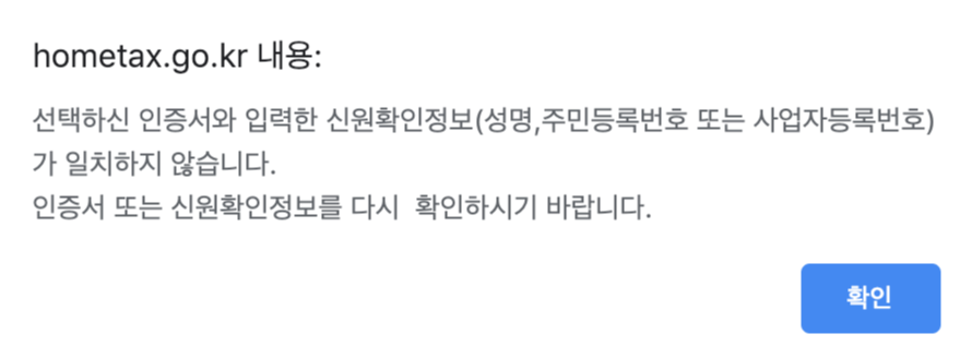 눈을 씻고 몇번을 쳐봐도 신원확인정보는 맞게 입력했는데, 홈택스 팝업에서는 계속해서 '선택하신 인증서와 입력한 신원확인정보가 일치하지 않는다'며 재확인의 재확인을 요구했다.